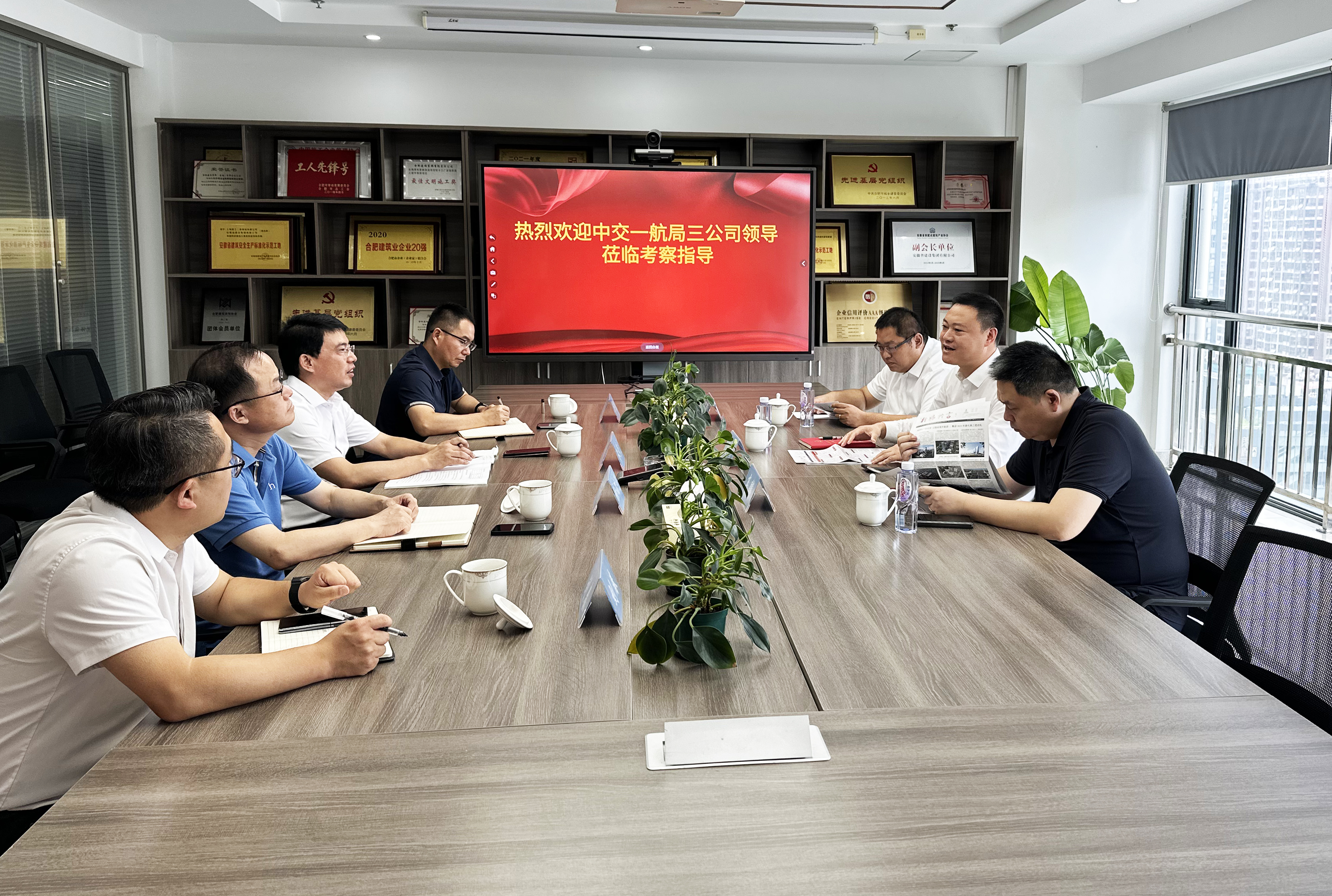 11月23日,市城鄉建設局機關三級調研員李敦鰲,機關黨委專職副書記李永, 綠節中心書記/主任杜德平、副主任張羅生一行蒞臨合肥建設裝飾集團開展“四送一服"及“四聯四定”結對幫扶座談會。集團書記/總經理徐瑞元、工會主席/綜合部部長程嬌、市場經營部部長李琴、技術中心副主任/質量部部長周振鐸等參加調研會議。